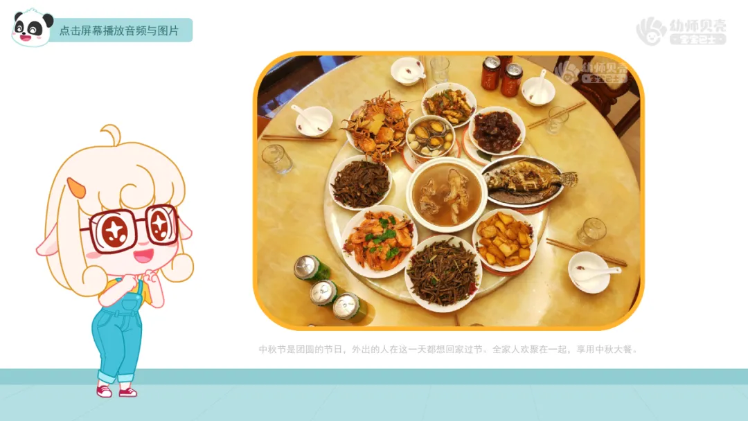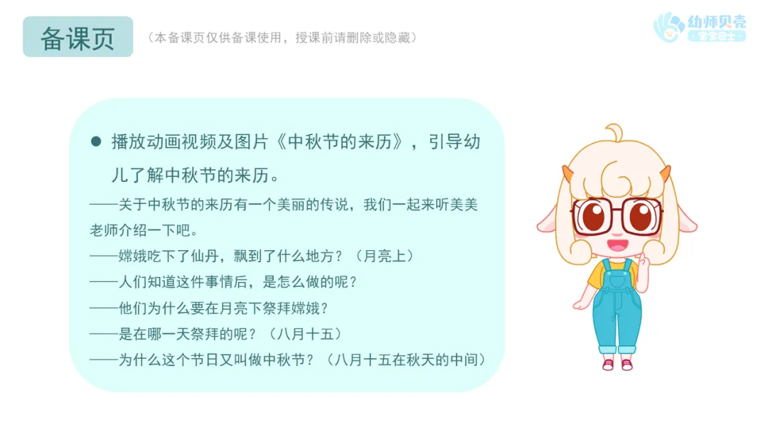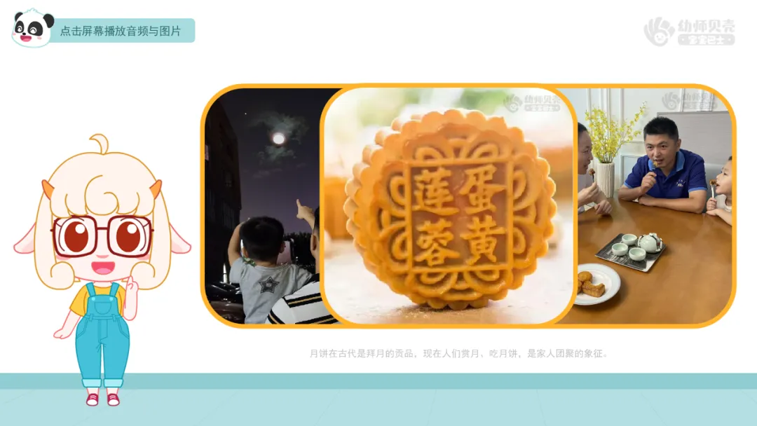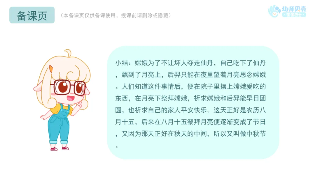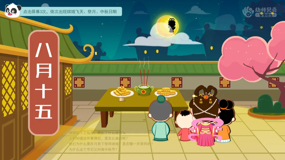 ——关于中秋节的来历有一个美丽的传说,我们一起来听美美老师介绍一下吧。