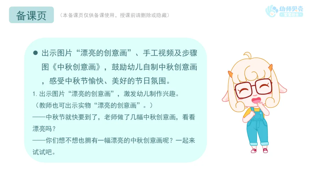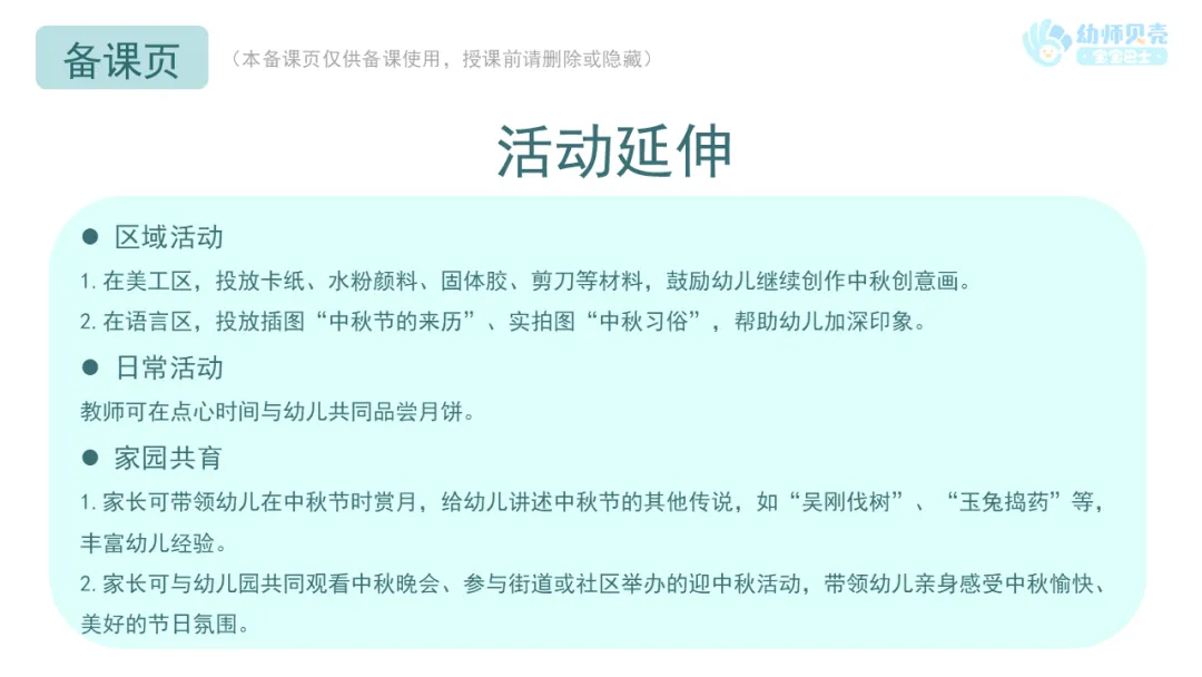 l教师可根据实际情况将本活动分两次开展,第一次活动了解中秋节的含义、来历及习俗,第二活动制作中秋剪贴画。教师也可将手工环节延伸至区域活动。