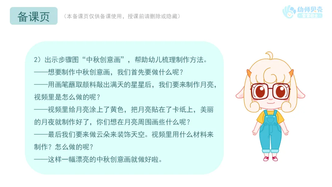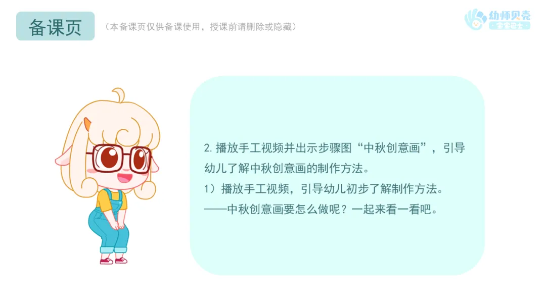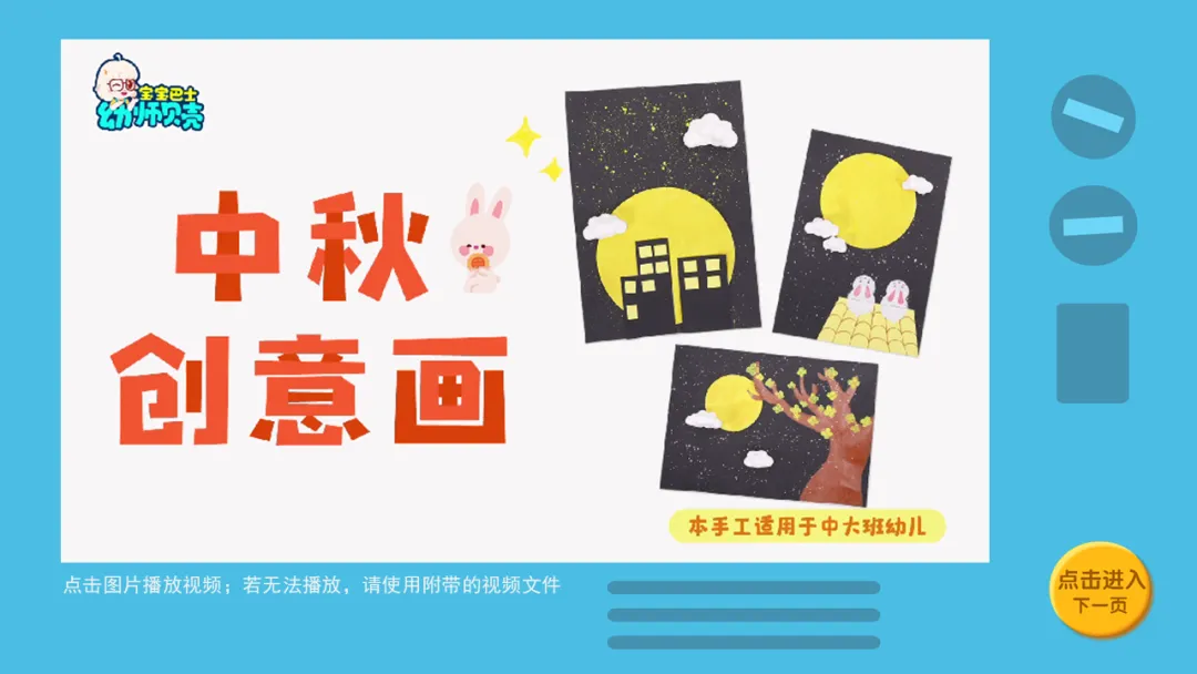 2.播放手工视频并出示步骤图“中秋创意画”,引导幼儿了解中秋创意画的制作方法。