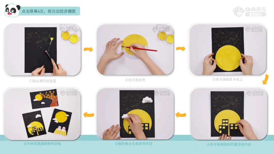 2)出示步骤图“中秋创意画”,帮助幼儿梳理制作方法。
