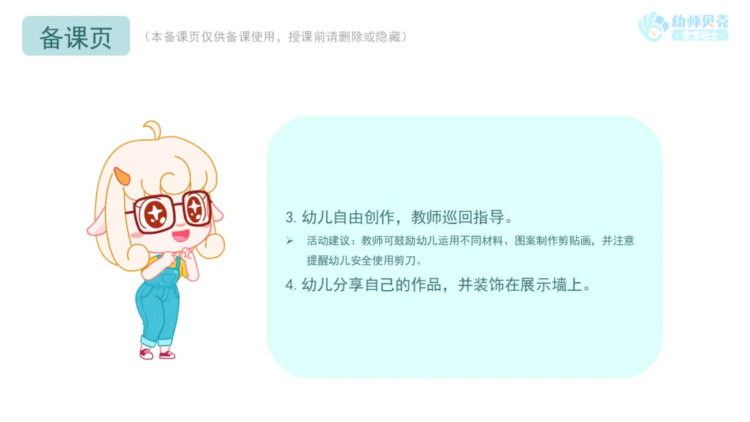 Ø活动建议:教师可鼓励幼儿运用不同材料、图案制作剪贴画,并注意提醒幼儿安全使用剪刀。