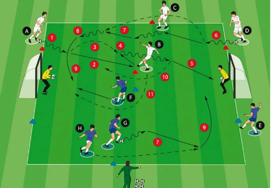通过连续一脚传球、二过一配合、交叉换位,强化小组默契。
