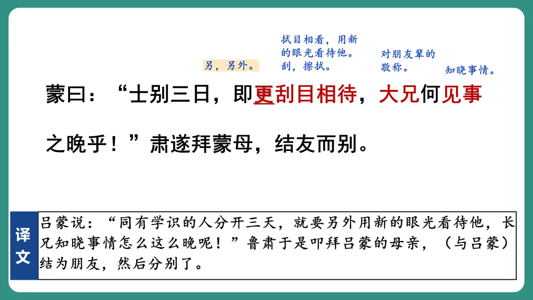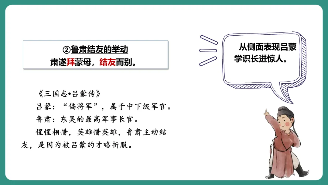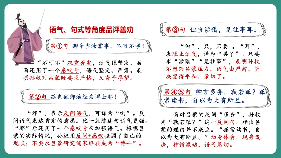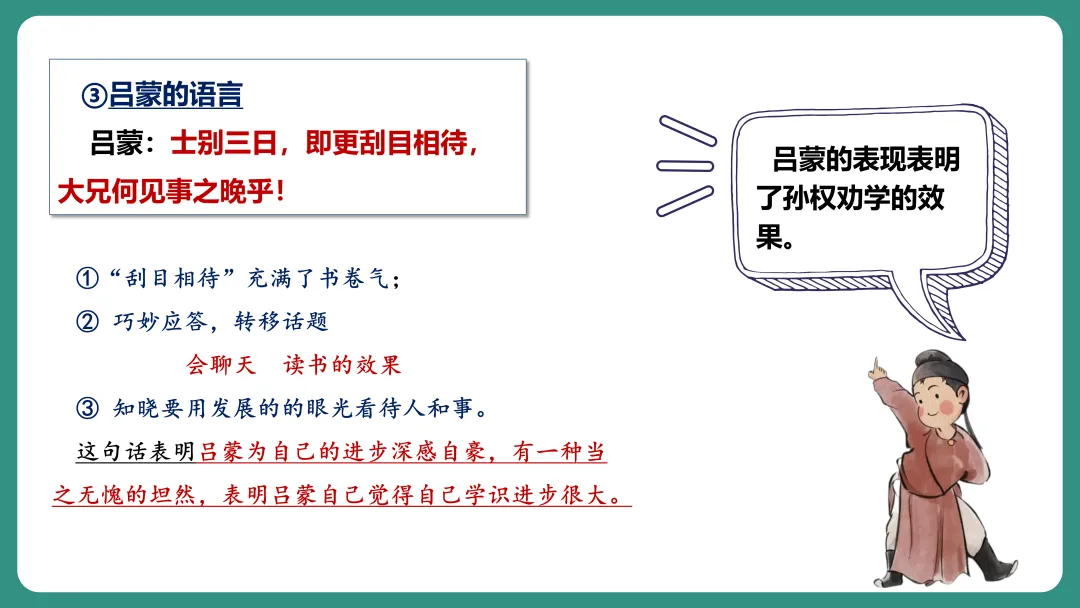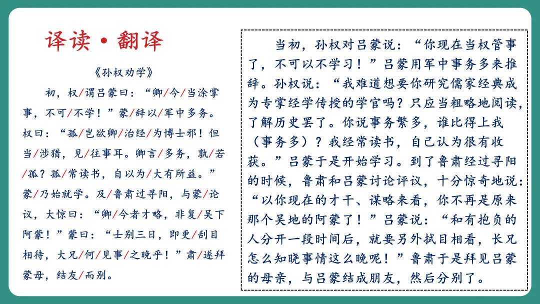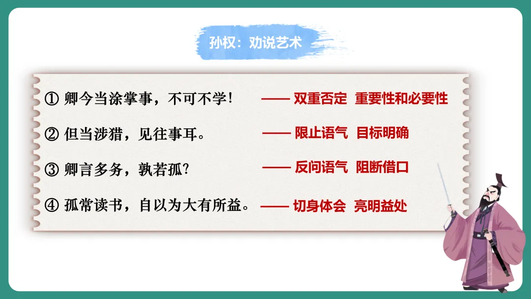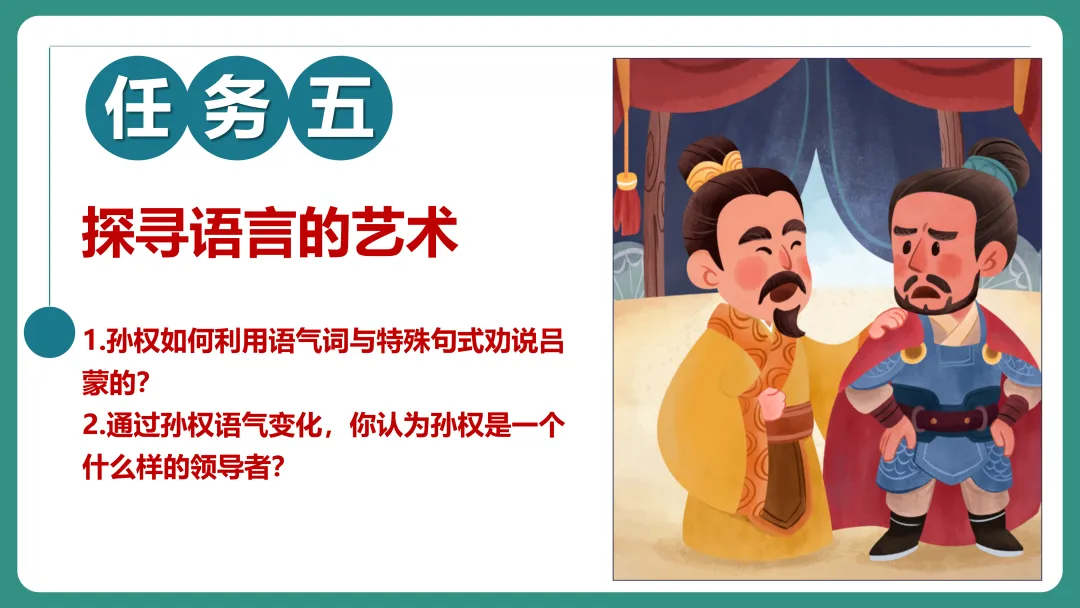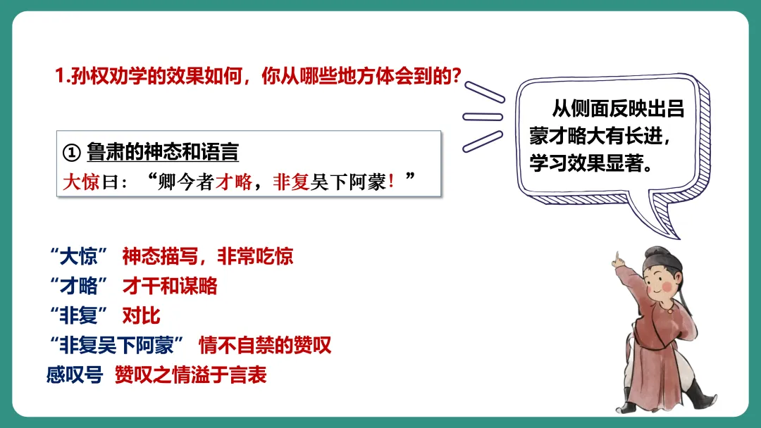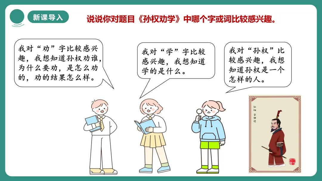 同学1:我对“劝”字比较感兴趣,我想知道孙权劝谁,为什么要劝,是怎么劝的,劝的结果怎么样。