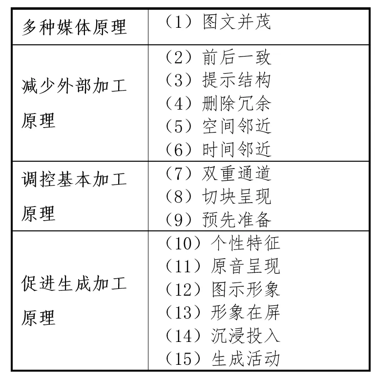 那老师们在使用AI生成课件或视频的时候,如何做才能符合 SOI 模型,促进学生大脑进行生成加工呢?秘诀就在于提示词和生成文档后与他对话让他修改时,使用多媒体学习认知理论的原理,最新版的15条原理如下表所示[4]:
