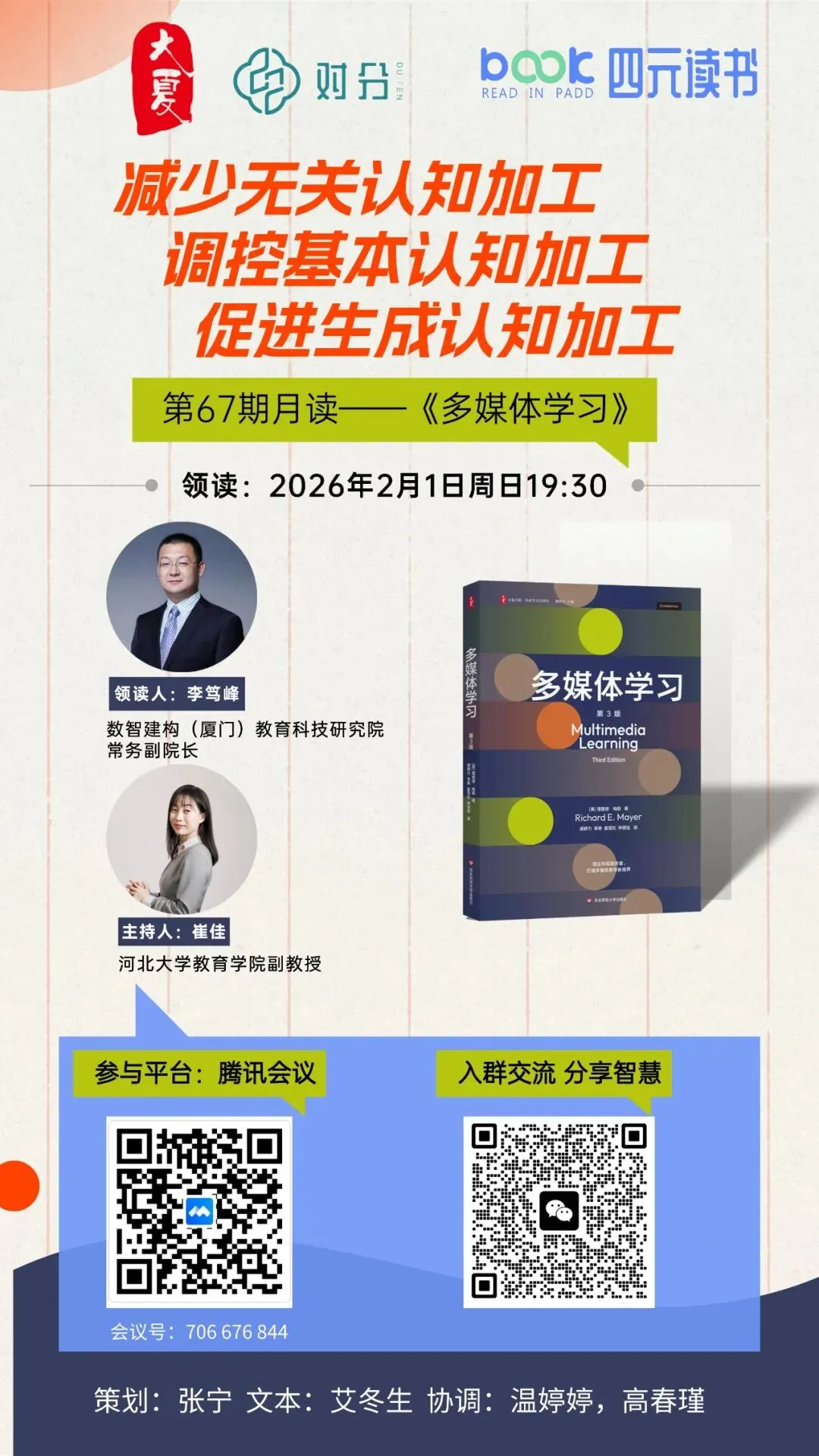 理查德·梅耶用 40 余年的时间,从科学的角度为教育工作者们具象化阐述了“技术不是神奇的魔法,教师才是真正的魔术师”这句话,说明了教育技术不应是昂贵硬件的堆砌,而应是对人类认知规律的敬畏。最好的设计,往往是那些为了成就学习者的思考而做的隐身设计。在AI 可以瞬间制造出无限精美教学资源的当下,所有的人正面临前所未有的信息通胀。作为教育工作者,我们或许该反思:当外界的吸引力大到无边无际时,教师该如何守护学生那有限、昂贵且不可再生的认知资源?梅耶的最新书籍《多媒体学习》(第三版)中文版,已于2025年11月在华东师范大学出版社出版。这本书是“四元读书”第67期的月读书目,我将在2026年2月1日,周日晚上七点半,在四元读书的腾讯会议中进行领读,欢迎感兴趣的老师参加(详见下方海报)。