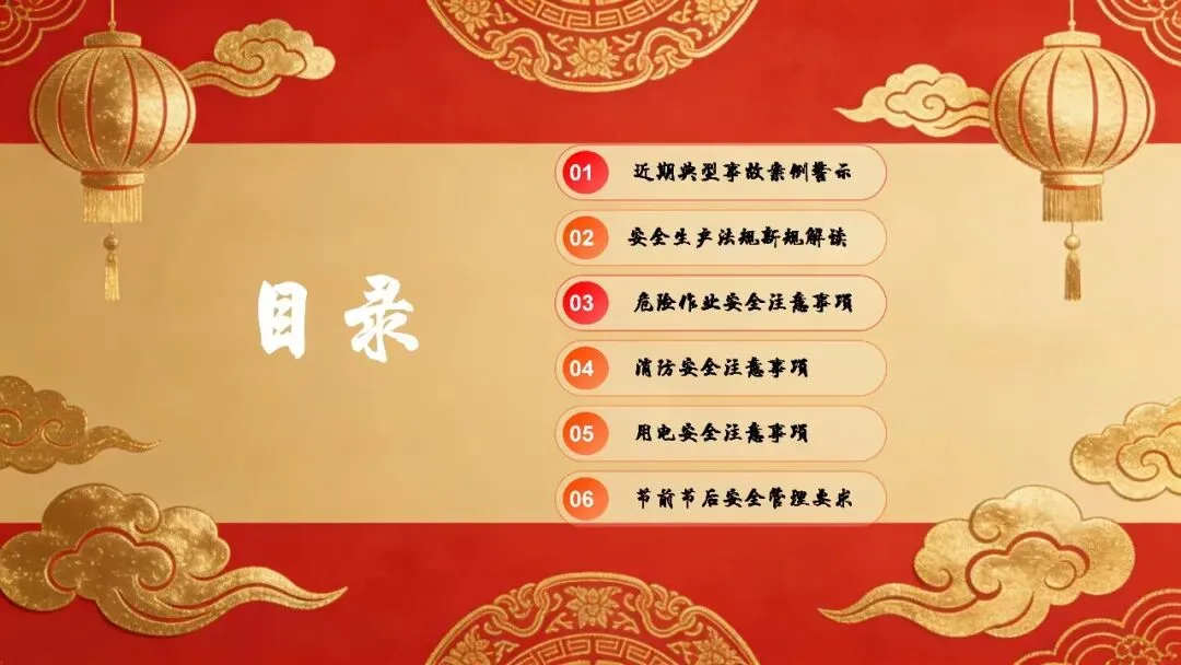 春节临近,生产经营活动进入关键阶段,同时节日期间人员思想容易松懈、安全风险隐患增多,为切实保障大家的生命财产安全,确保春节前后生产工作平稳有序,今天我们开展这次节前安全生产教育培训。本次培训将围绕典型事故警示、法规新规解读、危险作业规范、消防安全、用电安全以及节前节后安全管理等核心内容展开,希望大家认真听讲、牢记要点,把安全要求落实到实际工作中。