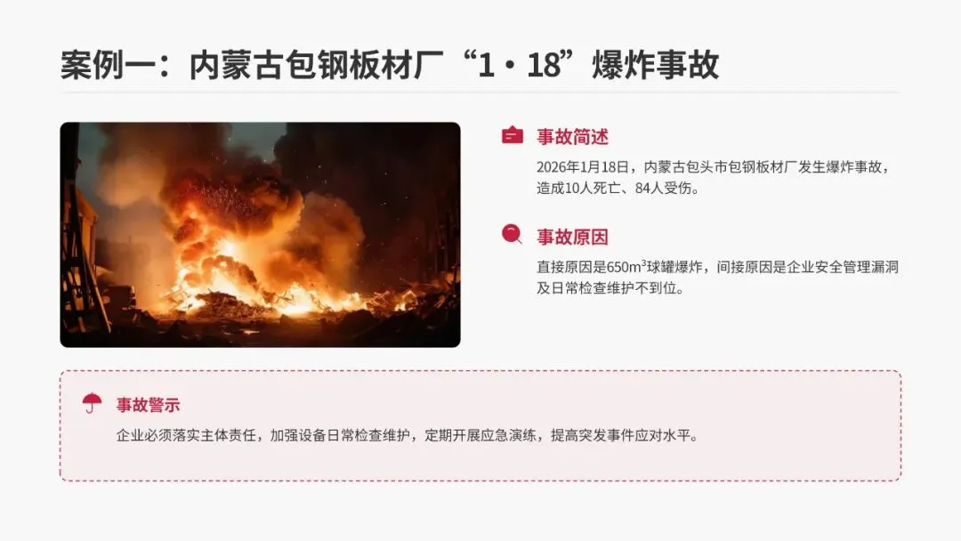 2026年1月18日,内蒙古包头市包钢板材厂发生爆炸事故,造成10人死亡、84人受伤的严重后果。经调查,直接原因是该厂650m³球罐发生爆炸,而间接原因在于企业安全管理存在漏洞,日常设备检查维护不到位。这起事故警示我们:企业必须严格落实安全生产主体责任,加强设备日常检查与维护,定期开展应急演练,切实提高应对突发事件的处置能力。