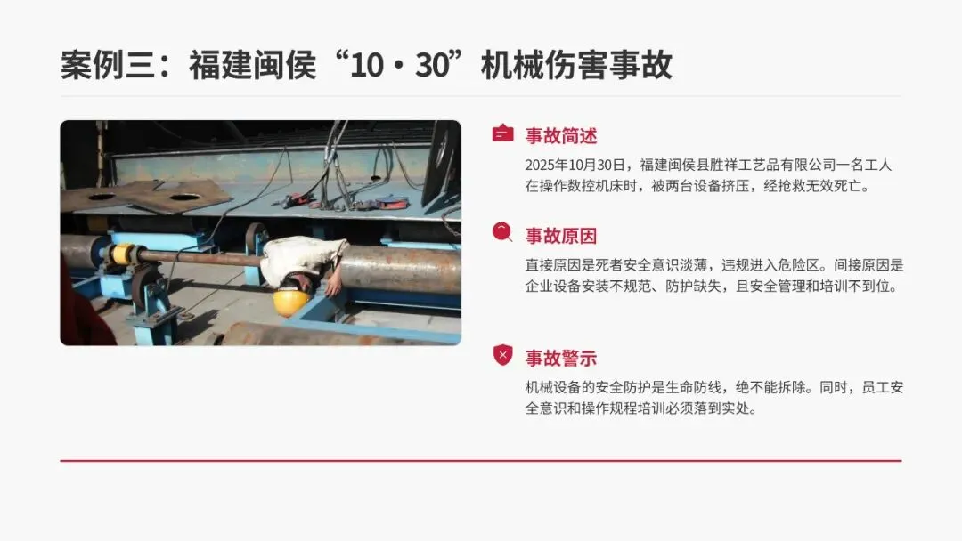 2025年10月30日,福建闽侯县胜祥工艺品有限公司一名工人在操作数控机床时,被两台设备挤压,经抢救无效死亡。直接原因是该工人安全意识淡薄,违规进入危险区域;间接原因是企业设备安装不规范、安全防护设施缺失,且安全管理和培训工作不到位。这起事故提醒我们:机械设备的安全防护是生命防线,绝不能随意拆除;同时,员工的安全意识培养和操作规程培训必须落到实处,不能流于形式。