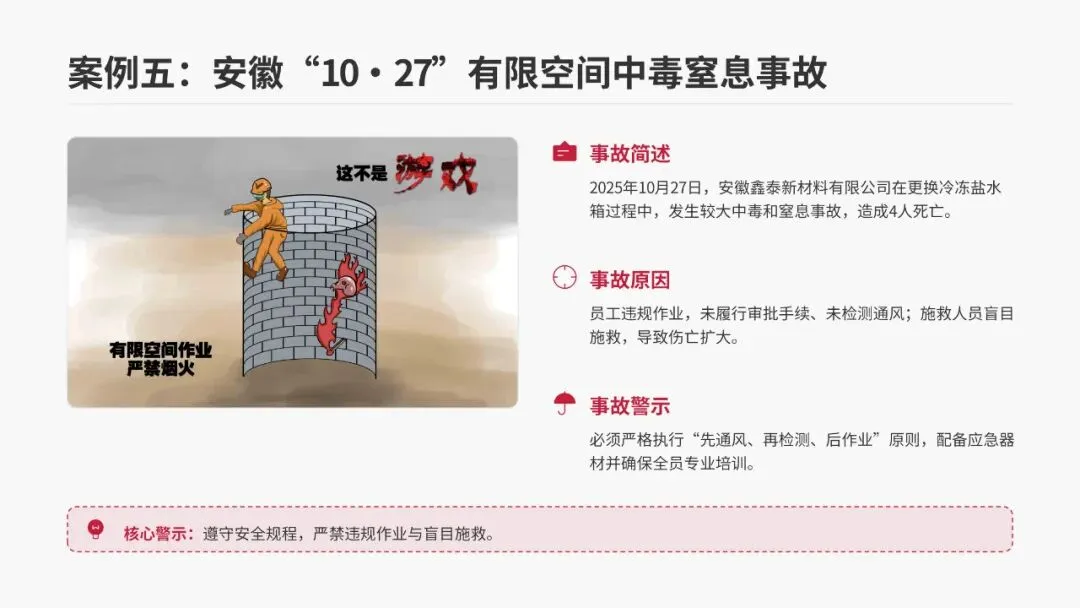 2025年10月27日,安徽鑫泰新材料有限公司在更换冷冻盐水箱过程中,发生较大中毒和窒息事故,造成4人死亡。事故原因是员工违规作业,未履行作业审批手续、未进行检测通风;后续施救人员盲目施救,导致伤亡扩大。再次强调:有限空间作业必须严格执行“先通风、再检测、后作业”原则,企业要配备齐全应急器材,并确保全体员工接受专业的应急培训。