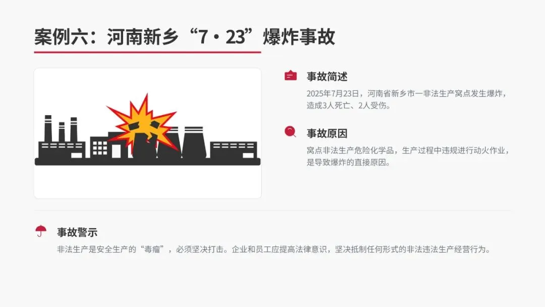 2025年7月23日,河南省新乡市一非法生产窝点发生爆炸,造成3人死亡、2人受伤。直接原因是该窝点非法生产危险化学品,生产过程中违规进行动火作业。这起事故表明:非法生产是安全生产的“毒瘤”,必须坚决打击。企业和员工都应提高法律意识,坚决抵制任何形式的非法违法生产经营行为。