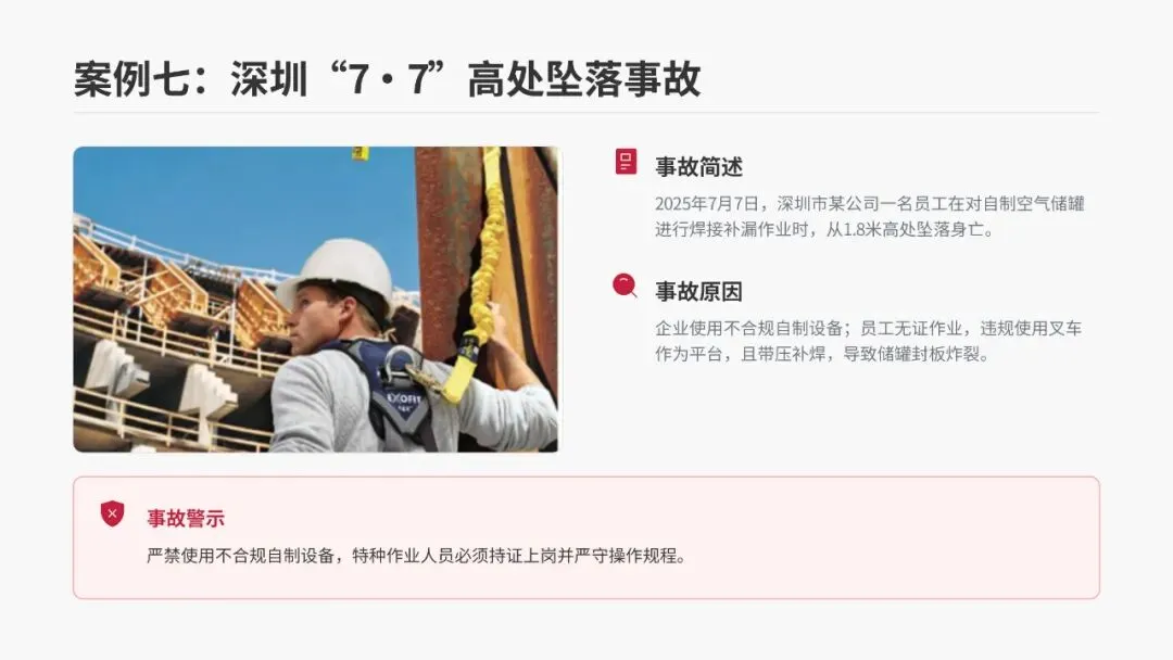2025年7月7日,深圳市某公司一名员工在对自制空气储罐进行焊接补漏作业时,从1.8米高处坠落身亡。事故原因是企业使用不合规的自制设备,员工无证作业,违规使用叉车作为作业平台,且存在带压补焊的危险行为,最终导致储罐封板炸裂。这警示我们:严禁使用不合规的自制设备,特种作业人员必须持证上岗,并严格遵守操作规程。