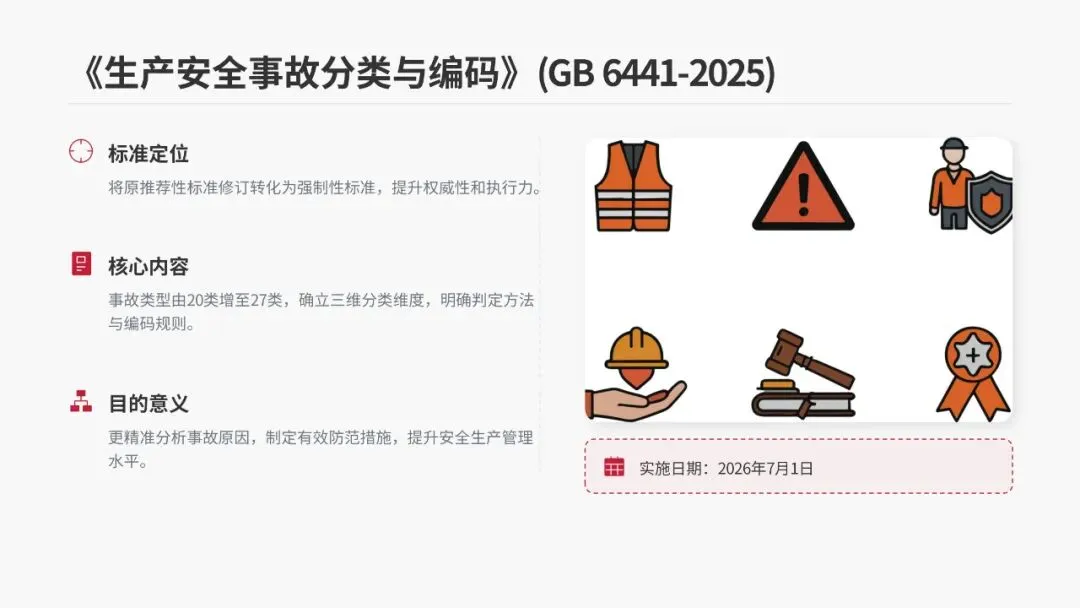 •目的意义:能够更精准地分析事故原因,帮助企业和相关部门制定更有效的防范措施,提升整体安全生产管理水平,该标准同样于2026年7月1日实施。