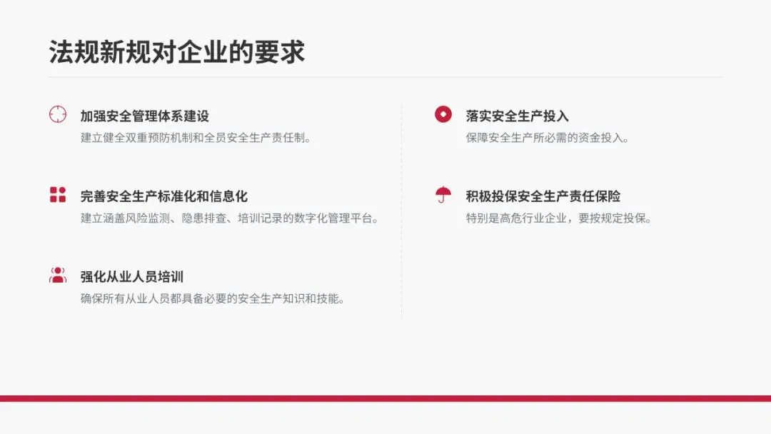 •双重预防机制法定化:明确要求构建风险分级管控和隐患排查治理双重预防机制,将原本的“推荐性”要求提升为“强制性”规定,企业必须严格落实。
