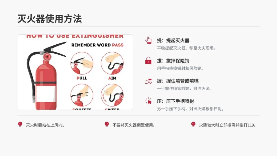 大家记住灭火器使用的“PASS”口诀,即提(Pull)、拔(Aim)、握(Squeeze)、压(Sweep):