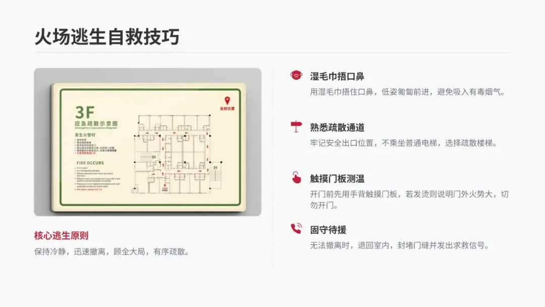 •核心逃生原则:保持冷静,迅速撤离,顾全大局,有序疏散,切勿贪恋财物。