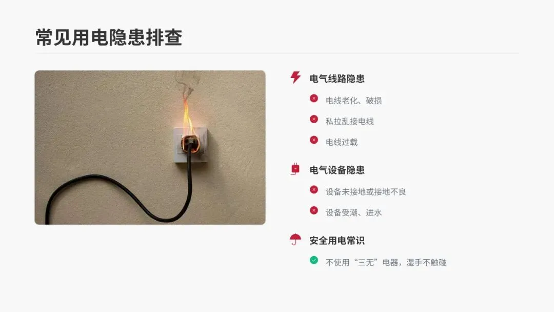 •电气线路隐患:电线老化、破损;私拉乱接电线;电线过载(同一插座接入过多大功率电器)。