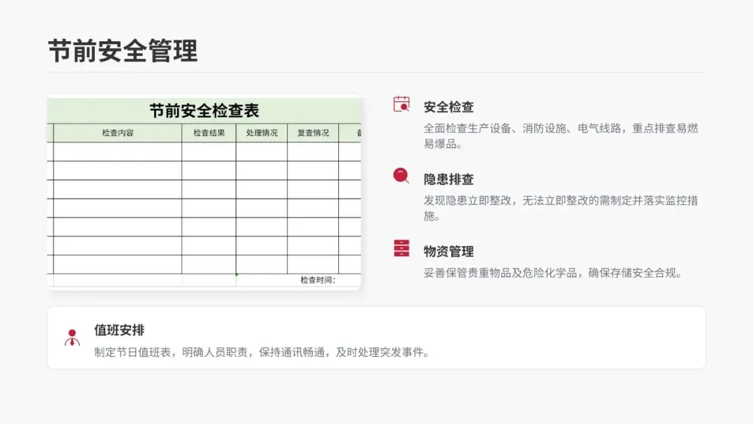 •值班安排:制定节日值班表,明确值班人员职责,确保值班期间通讯畅通,能够及时处置各类突发事件;值班人员要认真做好值班记录,发现问题及时上报。