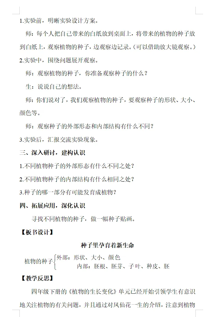 【科学教案课件】教科版小学科学四年级下册文本配套教案课件(含反思)《1.1种子里孕育着新生命》