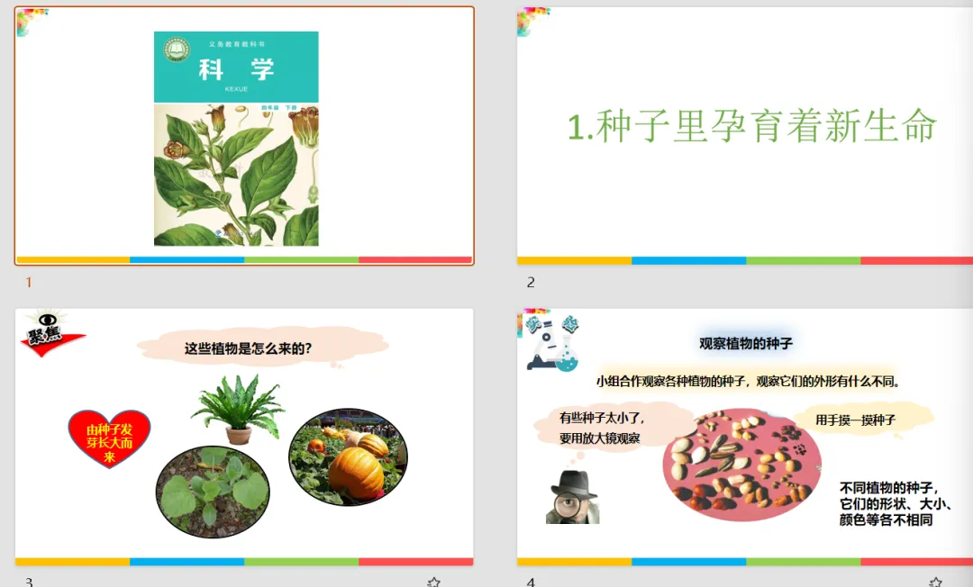 【科学教案课件】教科版小学科学四年级下册文本配套教案课件(含实验视频)《1.1种子里孕育着新生命》