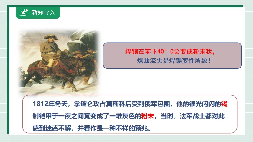 【新课导入】1812年冬天,拿破仑攻占莫斯科后受到俄军包围,他的银光闪闪的锡制铠甲于一夜之间竟变成了一堆灰色的粉末。当时,法军战士都对此感到迷惑不解,并看作是一种不祥的预兆。焊锡在零下40°C会变成粉末状, 煤油流失是焊锡变性所致!
