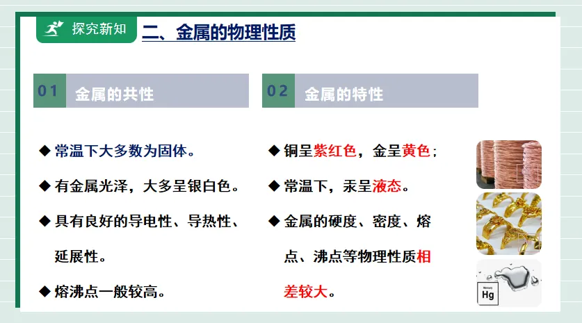 2.通过金属的物理性质知道用途以及金属材料在生产生活中的重要作用。