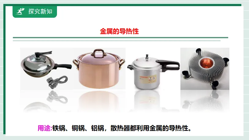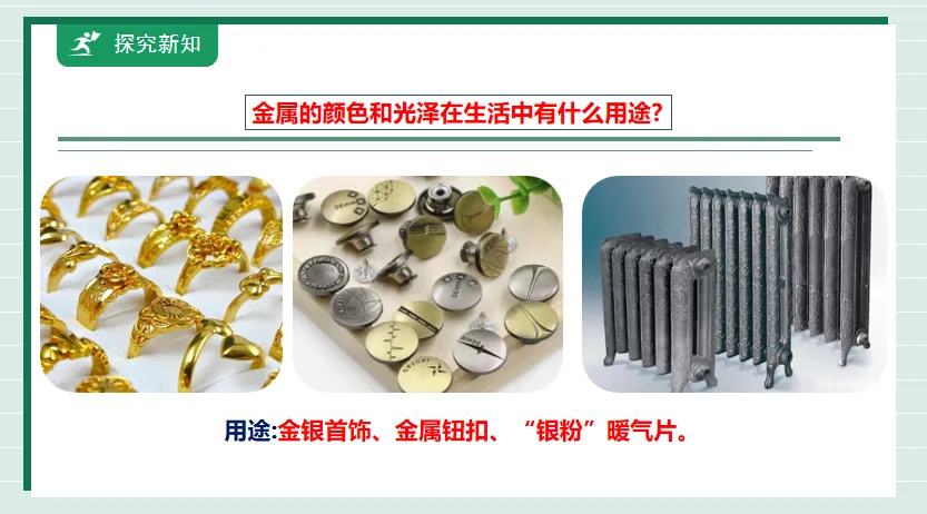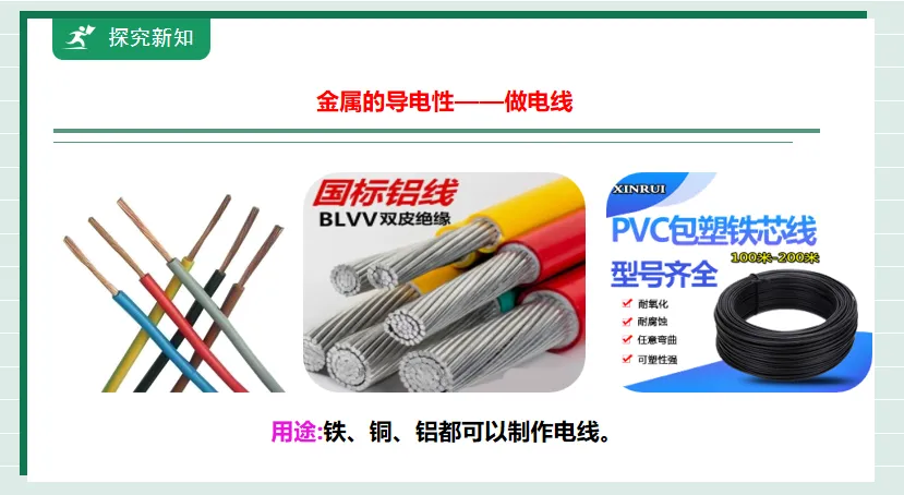 教师图片展示部分金属,学生探究:金属的物理性质和决定因素:①观察铁丝、铜丝、铝丝的颜色状态;②用力试试是否可以弯曲、折断;③用电池、小灯泡测铜片、铁片能否导电。