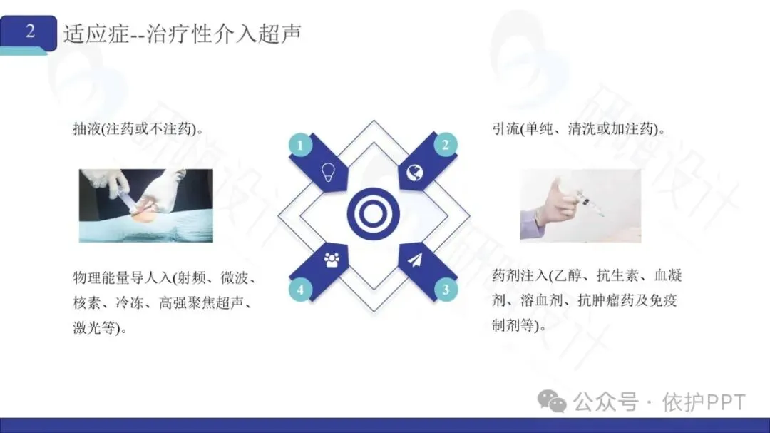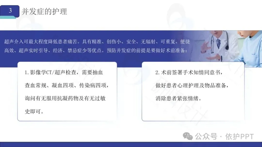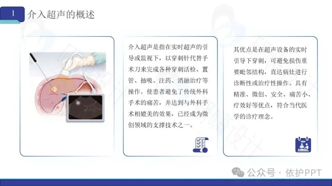 其优点是在超声设备的实时引导下穿刺,可避免损伤重要毗邻结构,直达病灶进行诊断性或治疗性操作。具有精准、微创、安全、痛苦小、疗效好等优点,符合当代医学的诊疗理念。