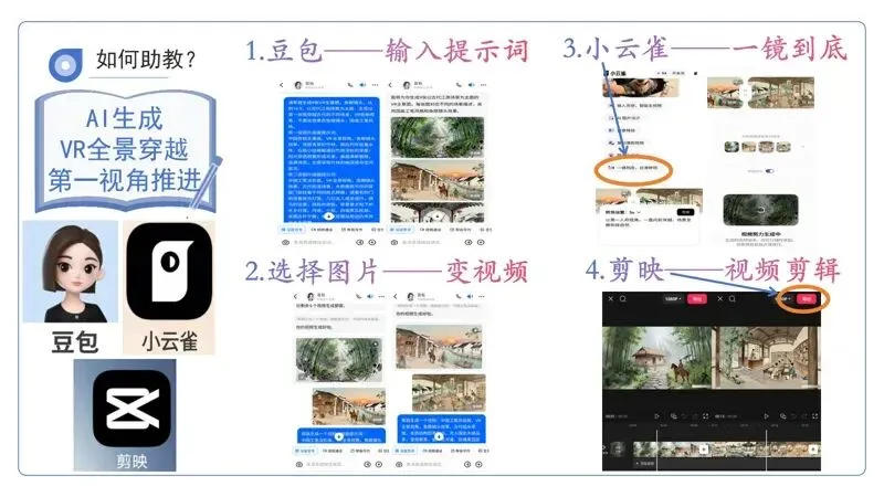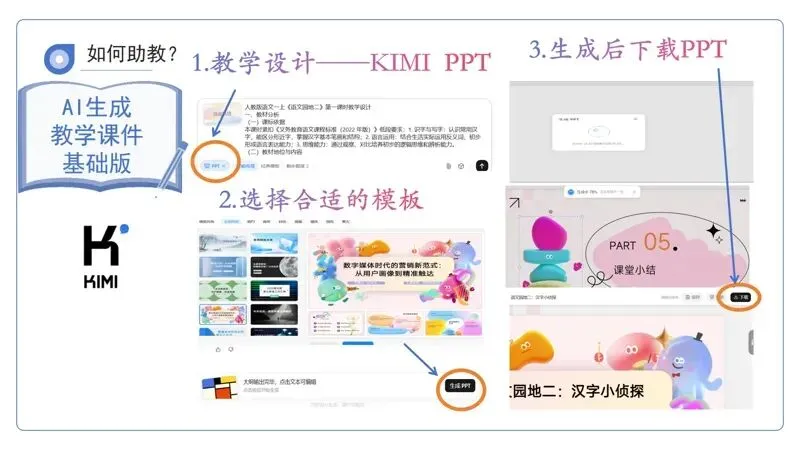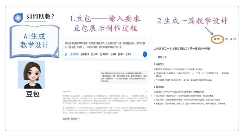 人教版一年级上册《语文园地二》紧扣新课标低年级学段要求,以识字写字、拼音运用为核心,兼顾积累与阅读。板块设计生活化、趣味化:识字结合拼音本封面,拼音练习融入动作游戏,通过《画》和《小白兔和小灰兔》渗透积累与亲子共读,夯实基础的同时培养语文学习兴趣,落实“工具性与人文性统一”的理念。针对本节课第一课时的教学设计,我将拼音和阅读板块抽离出来,聚焦“夯实基础、趣味启智”的核心目标,以“识字——古诗积累”为逻辑主线,融合趣味工具与卡通形象,让低年级学生在互动中巩固知识、提升能力。因此,对于一年级上册《语文园地二》第一课时的课件设计,我做了以下几个方面的实践探索 :在教学准备阶段,我借助了豆包来生成教学设计。 打开豆包网页版, 输入具体的教学要求,比如“ 请结合新课标 为一年级上册《语文园地二》设计一篇趣味启智的教学设计”,豆包会展示制作过程,最终生成一篇完整的教学设计,为我的教学规划提供清晰的框架。有了教学设计后,我利用KIMI PPT来制作课件。首先将教学设计或这一节课的标题输入KIMI PPT,KIMI会给出设计思路, 然后选择适合小学低年级语文教学的、充满童趣的模板,生成后即可下载PPT,让课件制作高效又美观。为了让课堂更具趣味性,我将课件模板进行了几处修改。用豆包和可灵AI生成数字人对口型内容。先在豆包中生成教学角色和角色说话内容,再通过可灵AI制作数字人,让数字人在课堂上“开口说话”,吸引学生的注意力,助力教学互动。 我将动物卡通形象朱迪兔和诗人王维带入教室,他们的开口让课堂变得更有活力。我借助豆包、即梦AI和剪映来生成角色视频通话。在豆包中输入角色要求,利用即梦AI生成角色视频,再通过剪映进行视频剪辑,制作出卡通角色“走进”课堂与学生对话的视频,让语文学习更具现实场景感。这次,我借助豆包、小云雀和剪映,打造VR全景穿越的教学资源。在豆包中输入提示词,选择相关图片,通过小云雀的 “一镜到底”将图片变成 以人物第一视角推进的视频,再用剪映剪辑,为学生呈现如古诗场景般的全景穿越体验,让学生沉浸式感受语文的魅力。我利用豆包和剪映,还原北宋学堂的教学场景。在豆包中输入提示词,选择相关图片并将其变成视频,再用剪映剪辑,为学生展现古代学堂的风貌,辅助汉字等内容的教学,增强学生的历史文化感知。这一次,我通过即梦AI生成动态全息人物互动投影。先让即梦AI生成相关图片,再选择图片生成视频,制作出如古代文人“现身”课堂与学生互动的动态效果,让语文教学充满科技感与趣味性。 此外,我还运用相同AI技术加上剪映生成动态全息建筑动画,将古代学校的模型生动展现,增加学生对古建筑的了解。借助WPS Word和Deep Seek,可以生成课堂游戏网页。在WPS Word中输入要求,让Deep Seek执行要求,制作出如语文知识闯关类的网页游戏,让学生在游戏中巩固语文知识。最后,以《探秘语文宝藏——走进一年级上册〈语文园地二〉》课件为例,探秘过程包括“朱迪带路趣导入”“走进学堂认汉字”“王维话里说灵感”“课堂小结谈收获”这4个环节,这些环节的设计都可以借助上述AI工具来丰富呈现形式,让小学低年级语文教学更具趣味性和实效性。对小学低年级课堂而言,课件设计更看重直观性和童趣,要能吸引孩子的注意力,帮助他们理解抽象知识。AI工具确实能轻松做出色彩鲜艳、动画丰富的课件,但反观我们的课堂,真正打动学生的,都是那些融入了教师对学情的观察、对知识点的巧思改编的内容。因此,AI助力课件设计的背后,更需要我们反思:如何让AI成为教师的“帮手”,而非“替代者”。靳颖颖,漯河市临颍县樱桃郭学校语文教师。自参加工作以来,深耕小学语文教学一线,同时担任班主任工作,始终秉持“用爱育人,用心教学”的教育理念。她的教学风格生动有趣、深入浅出,善于将枯燥的知识点转化为孩子们喜闻乐见的形式,课堂氛围轻松活泼,深受学生喜爱;日常工作中,关注学生的成长动态,从学习困惑到生活烦恼,都耐心倾听、悉心引导,用温暖与真诚赢得了学生的信赖和家长的高度认可。从教以来,她积极参与省、市、县、校组织的各项活动,凭借扎实的专业素养和出色的班级管理能力,荣获县级骨干教师等荣誉称号,并获得2025年基础教育精品课“省级三等奖”、曾获得信息技术与课程融合优质课“市级二等奖”、县级优质课评比一等奖,所带班级在校内多项活动中均收获一等奖等荣誉。她在教育之路上不断探索前行,努力成为学生成长路上的引路人与守护者。投稿信箱:lyxrgzn@163.com,聚焦AI赋能教育,欢迎每一份创新与实践成果投递!投稿须知: