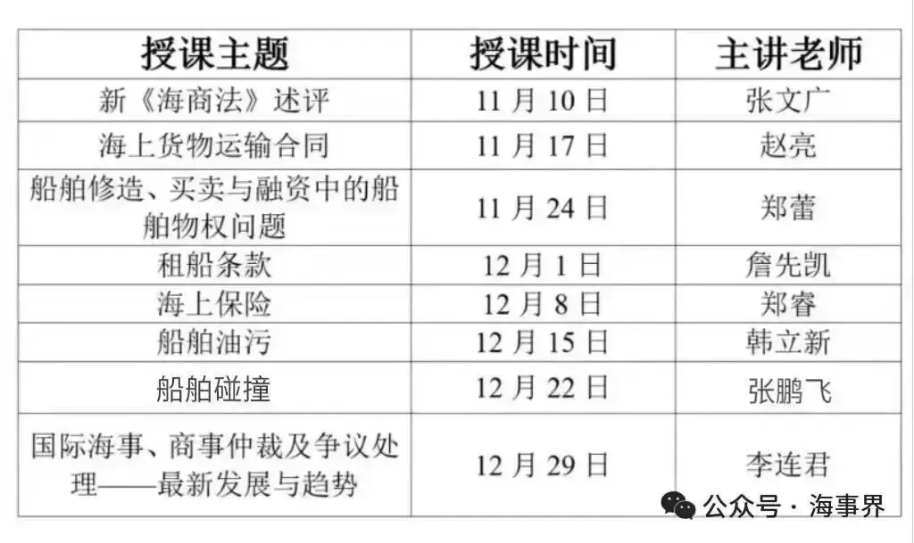 该课程由中国社会科学院海洋法治研究中心牵头、中国社会科学院大学国际商法研究中心承办,邀请8位知名海商法专家轮流进行教学,