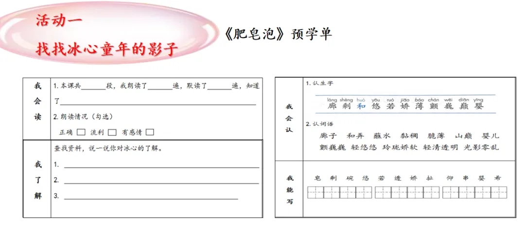 师:课前同学们借助预习单预习了课文,对本文的作者冰心有哪些了解?