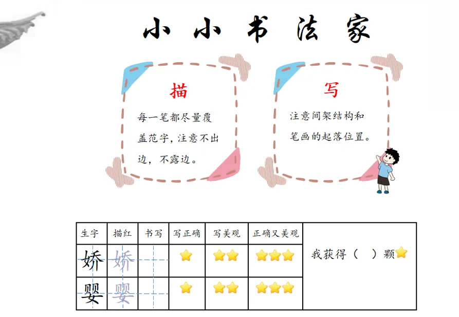 师:位置不同,写法就不一样,伸出手和老师一起写一写。先来写娇,女在左,横变提,撇折变小才秀气。再来写婴,女在下,女字扁扁横长稳,在学习单上写一写,先描再写。