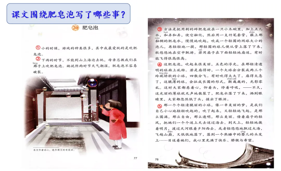 师:继续加油,看来生字难不倒大家了,让我们一起走进《肥皂泡》。