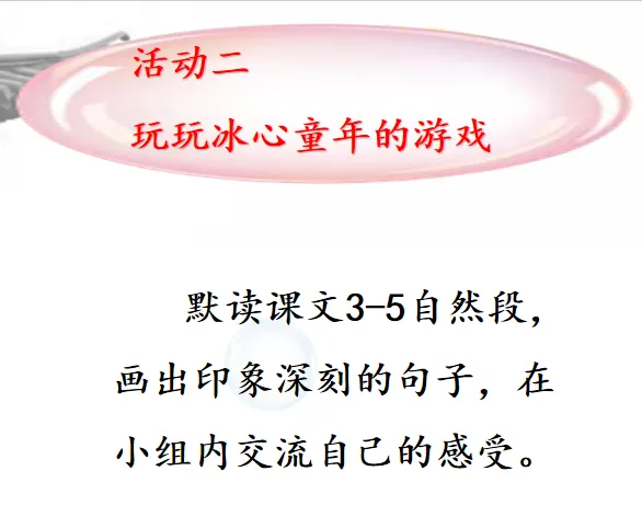 师:是的,这是冰心想到的。课文写的就是冰心小时候吹肥皂泡,看肥皂泡以及小肥皂泡的事,那就让我们和冰心一起去玩玩有趣的游戏。生:默读课文3~5自然段,画出印象深刻的句子,在小组内交流自己的感受。