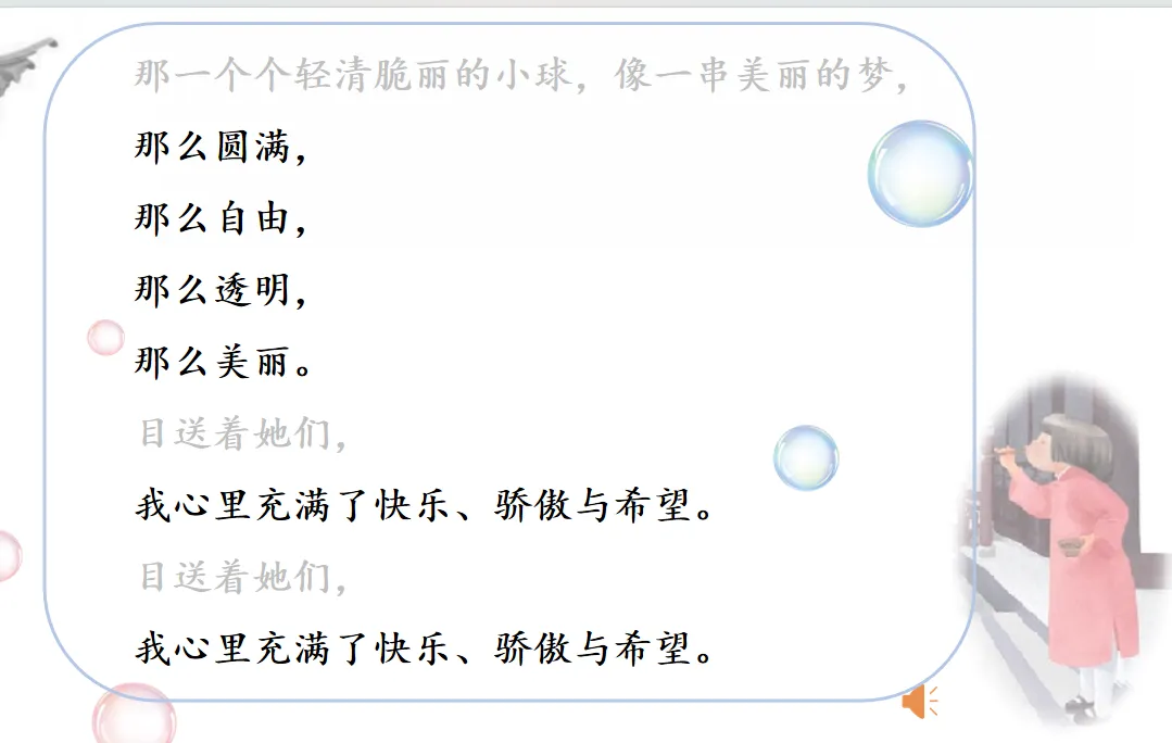 师:我请一位同学来读一读这一段,其他同学做动作,我们一起来感受这吹肥皂泡的乐趣。准备好了吗?好。