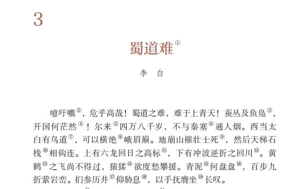 古体诗又称“古诗”“古风”,是与近体诗相对而言的一种诗体,主要是指唐以前的乐府民歌、文人诗以及唐以后文人仿照它们的体式而写的诗歌。古体诗格律自由,不拘对仗、平仄,押韵较宽,篇幅长短不限,句子有四言、五言、六言、七言和杂言。表现在诗题上,有歌、行、引、吟等体裁。《蜀道难》就是一首典型的古体诗。初读感悟