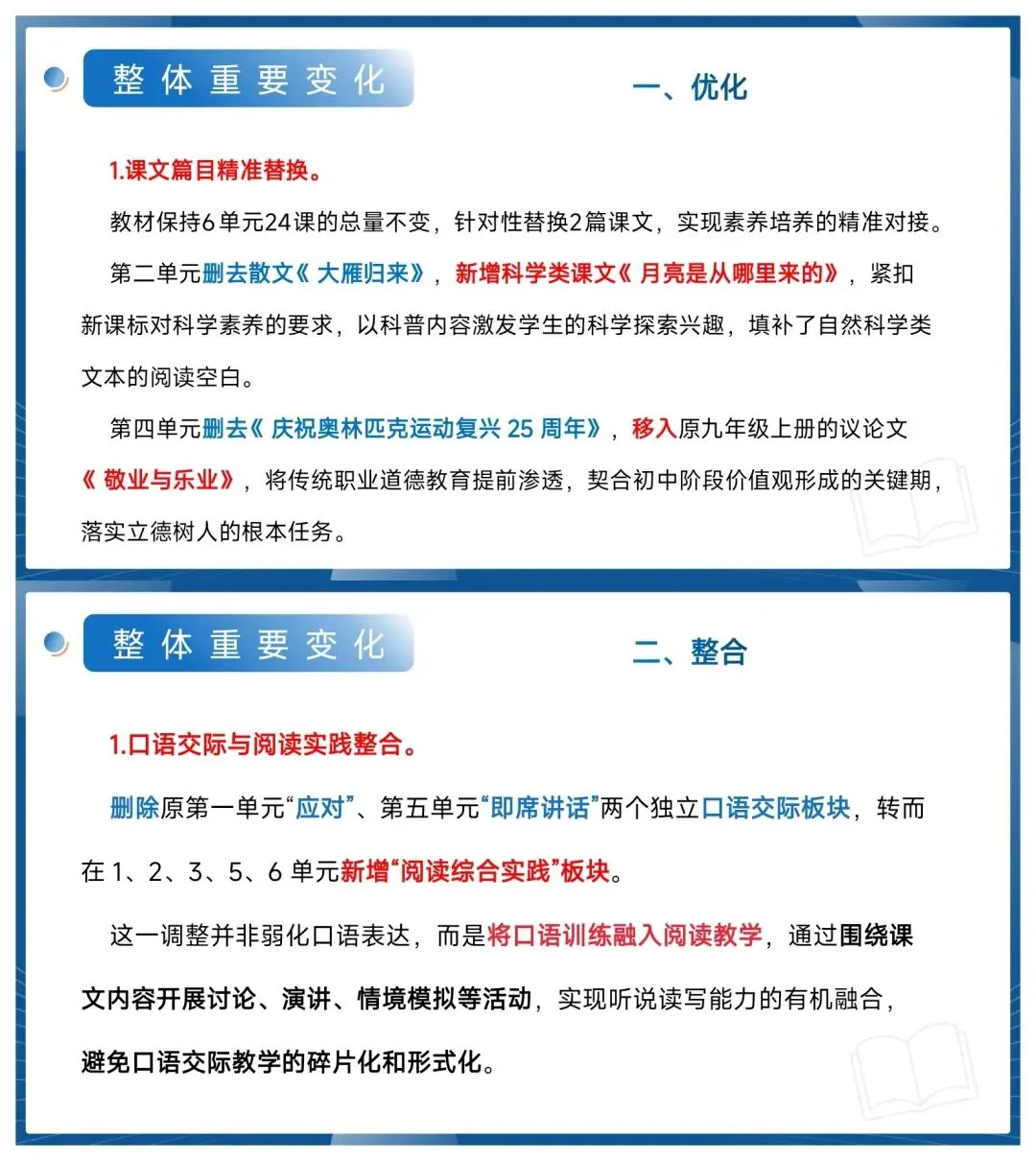 新版教材不仅换了2篇课文(《大雁归来》换《月亮是从哪里来的》《庆祝奥林匹克运动复兴25周年》换《敬业与乐业》),还新增了阅读综合实践、升级了整本书阅读板块,连写作任务都改成了“考虑目的和对象”“负责任地表达”!