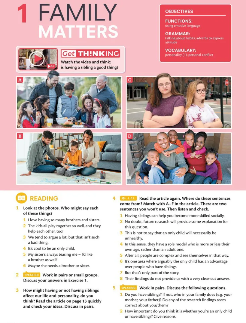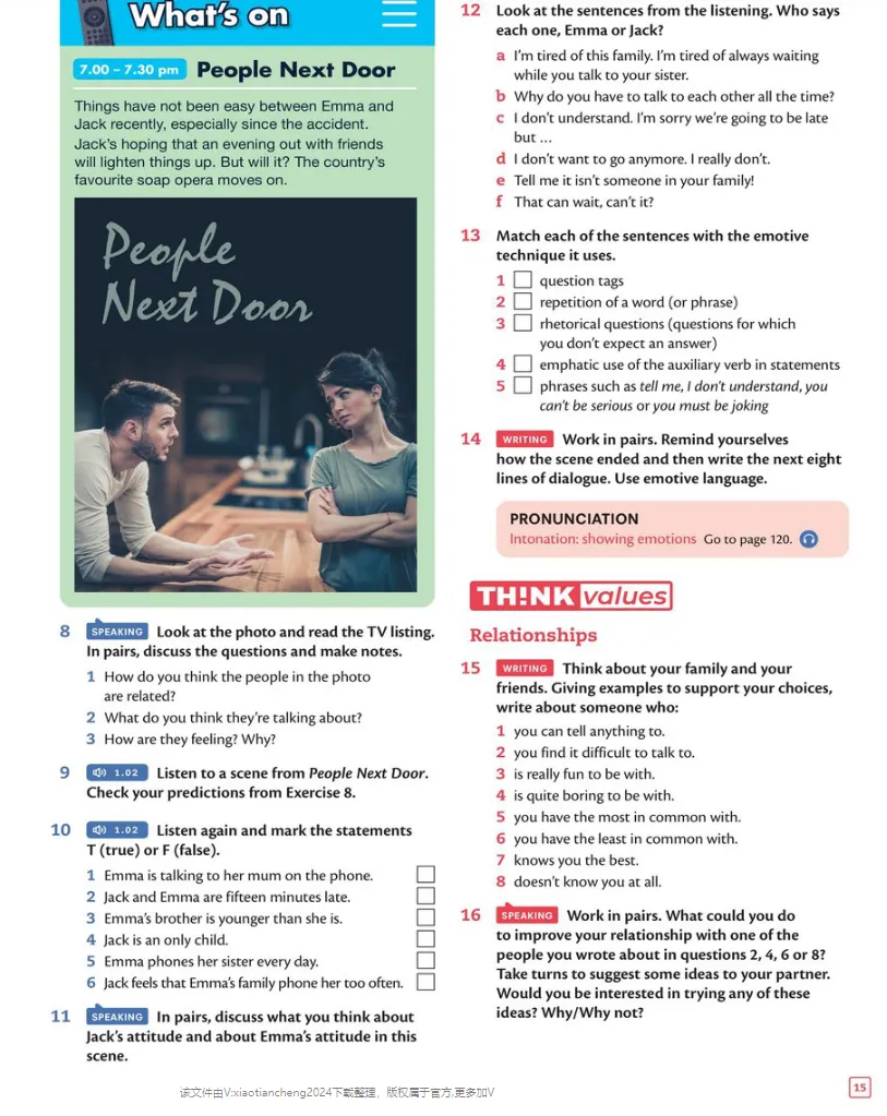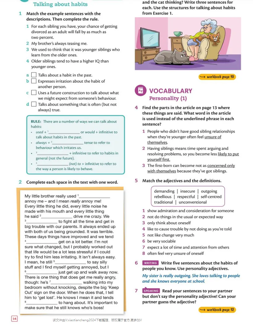 每个级别含1个欢迎单元+12个主题单元,围绕青少年感兴趣的人际交往、自我成长、团队合作、偶像文化等话题展开,贴近认知更易产生共鸣。全套PDF高清版,每个单元按“单词→句子→文章→思辨”阶梯设计,涵盖听、说、读、写、语法、词汇六大模块,每个模块搭配2-6个分层练习,循序渐进夯实基础。
