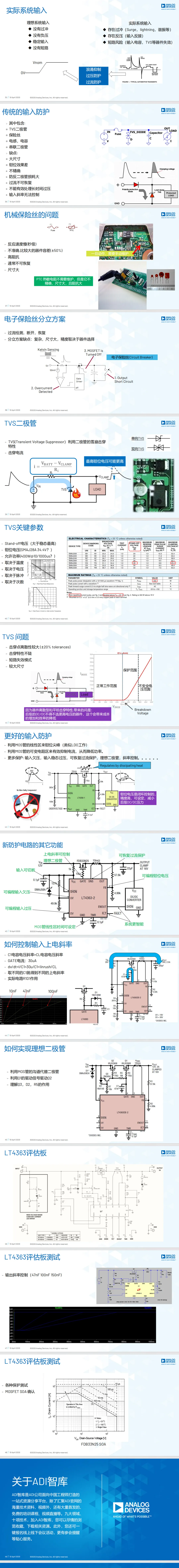 讲义里藏着哪些干货?全是硬菜:✅ 电荷泵电路深度解析:原理、拓扑结构(升压 / 降压 / 反相)、与 LDO / 开关变换器的实战对比,还有 LTC3245 等明星芯片的应用方案,解决效率与体积的平衡难题;✅ LED 驱动设计宝典:从 LED 特性、门限电压到恒流驱动芯片选型,再到模拟调光 / 数字调光的实测对比,覆盖消费电子到工业照明的核心需求;✅ 浪涌防护避坑指南:传统 TVS 二极管的局限性、新型 MOS 管防护电路设计,含过压 / 过流 / 反接保护的完整方案,适配汽车电子等严苛场景;✅ 实测数据 + 电路图纸:ADI 原厂评估板测试结果、关键参数计算(如效率、功率密度)、PCB 布局要点,直接对接实际项目。