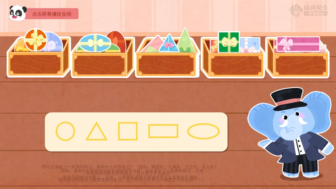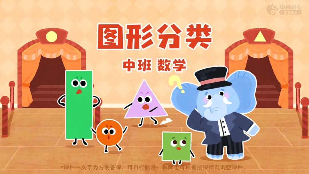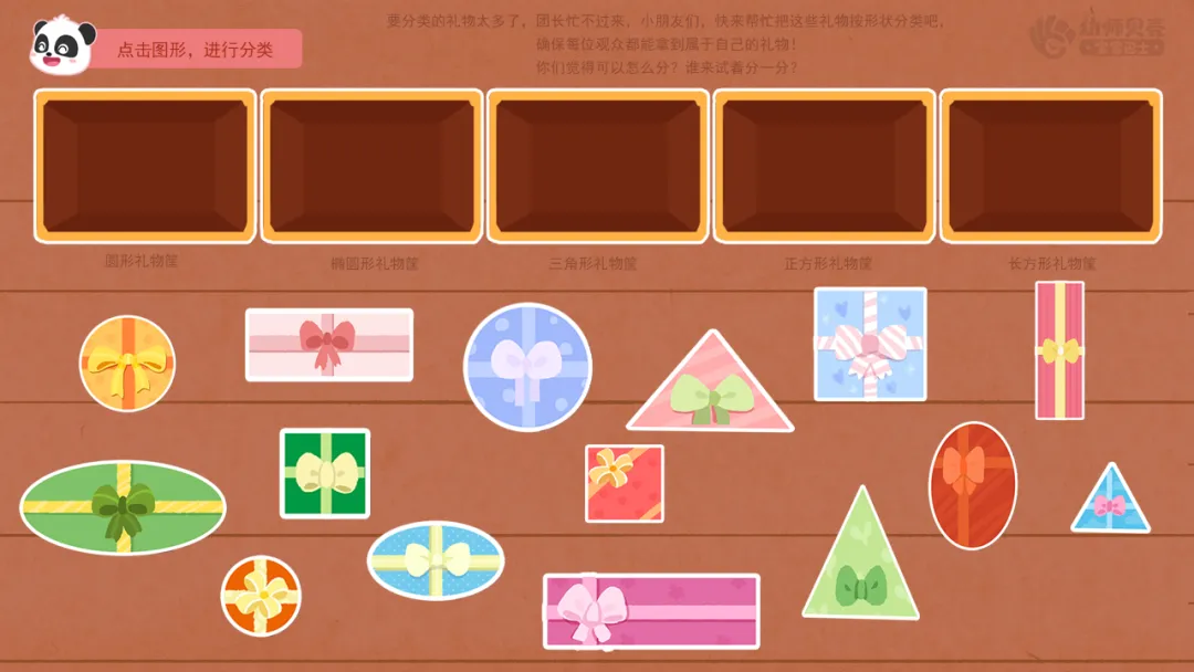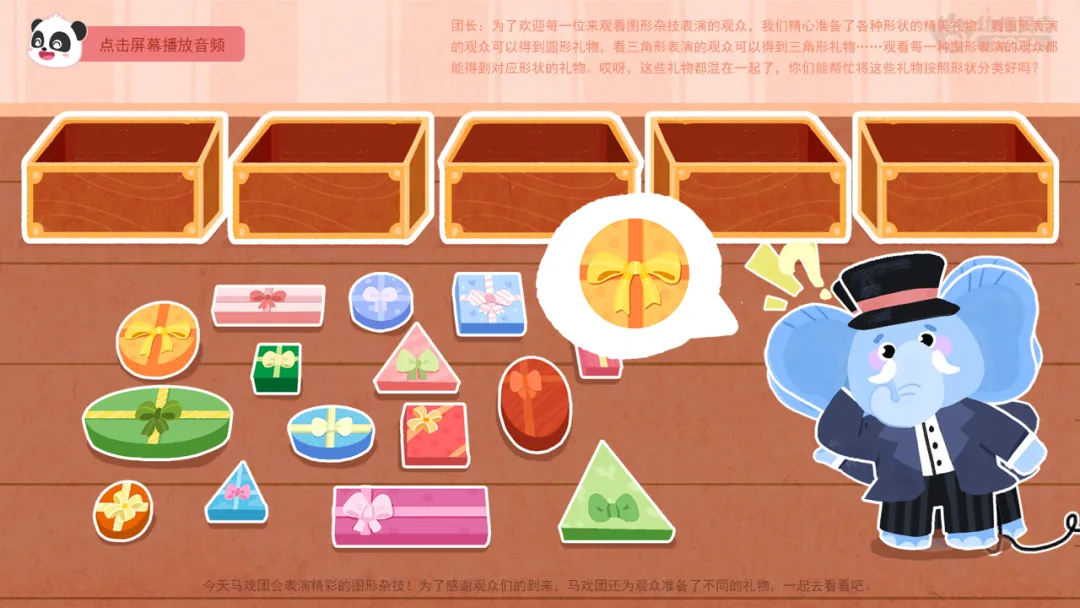 ——要分类的礼物太多了,团长忙不过来,小朋友们,快来帮忙把这些礼物按形状分类吧,确保每位观众都能拿到属于自己的礼物!