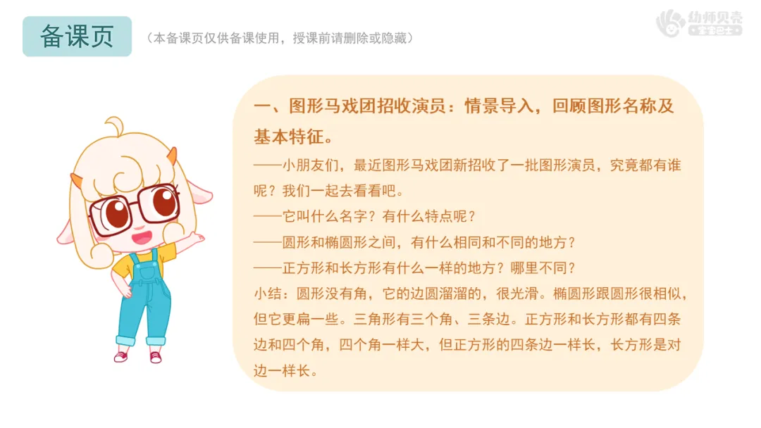 2.组织游戏“图形杂技秀”,根据语音判断符合特征的图形,进一步巩固图形分类。