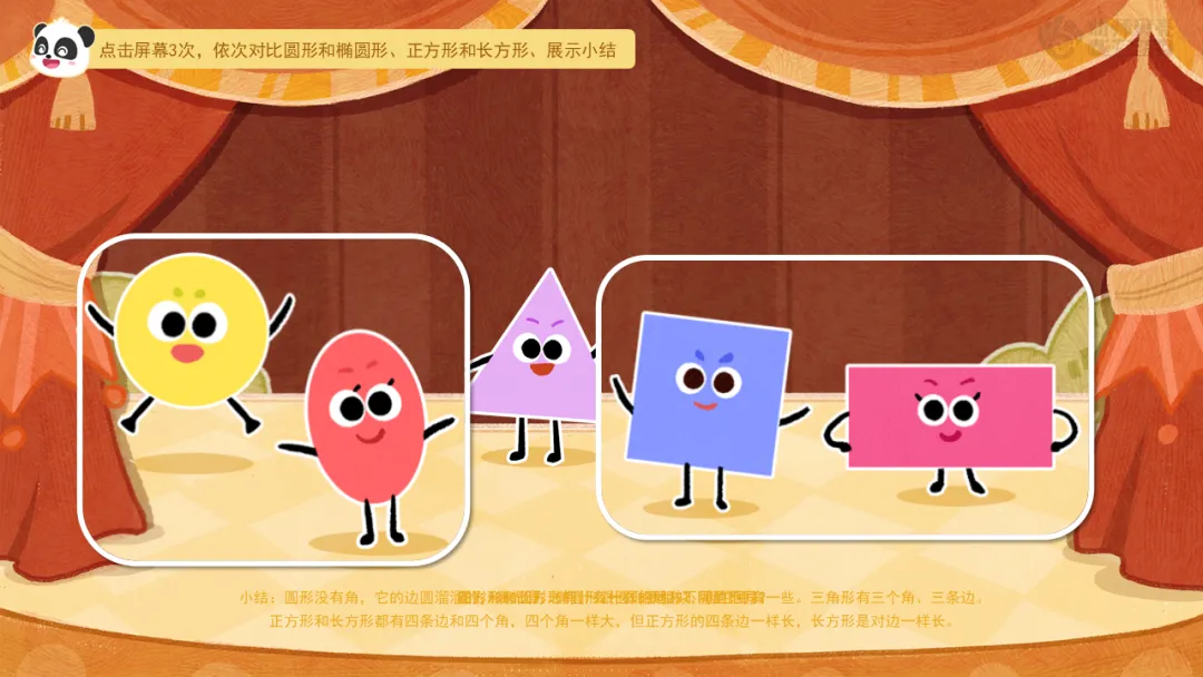 小结:圆形没有角,它的边圆溜溜的,很光滑。椭圆形跟圆形很相似,但它更扁一些。三角形有三个角、三条边。正方形和长方形都有四条边和四个角,四个角一样大,但正方形是四条边一样长,长方形的对边一样长。