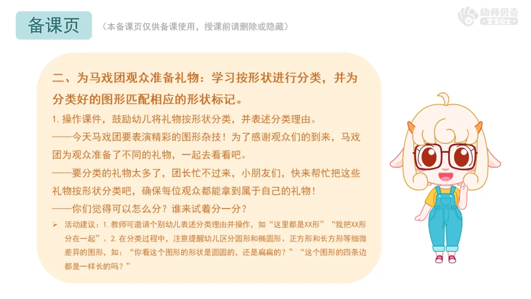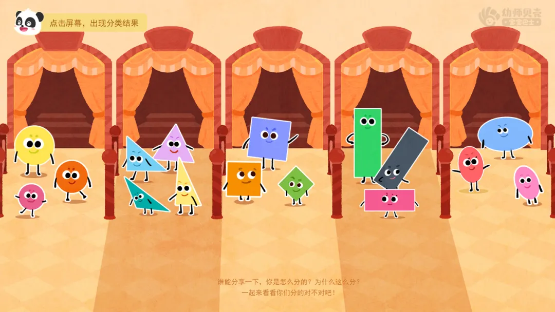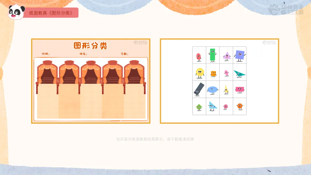 二、为马戏团观众准备礼物:学习按形状进行分类,并为分类好的图形匹配相应的形状标记。