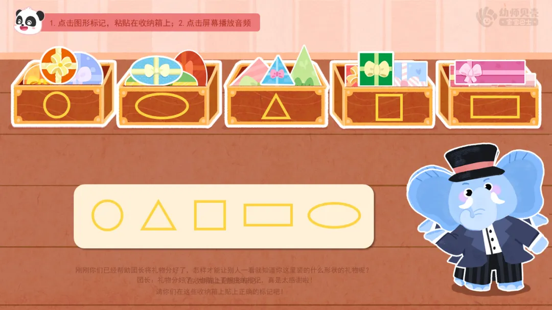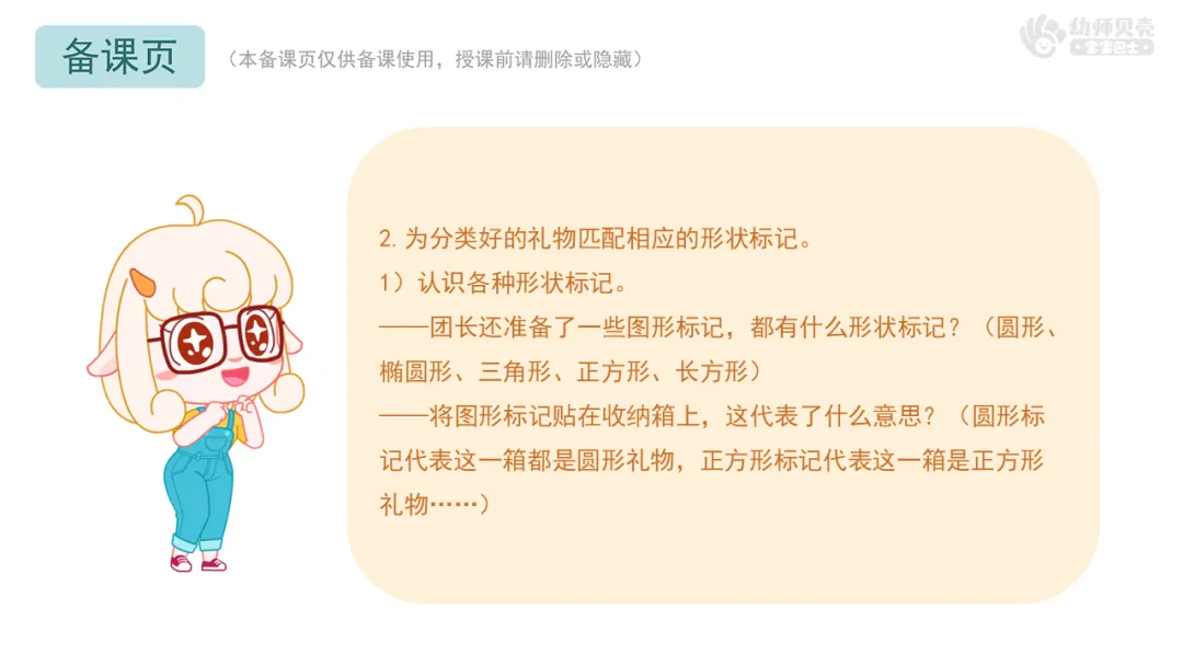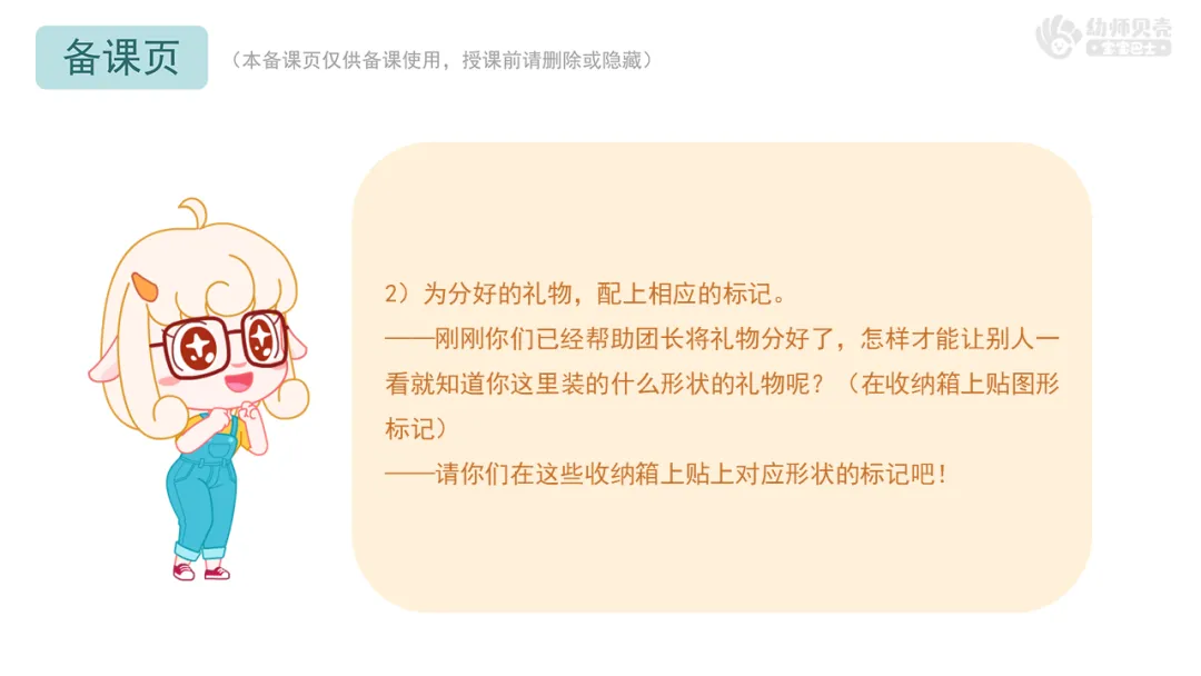 ——刚刚你们已经帮助团长将礼物分好了,怎样才能让别人一看就知道你这里装的什么形状的礼物呢?(在收纳箱上贴图形标记)