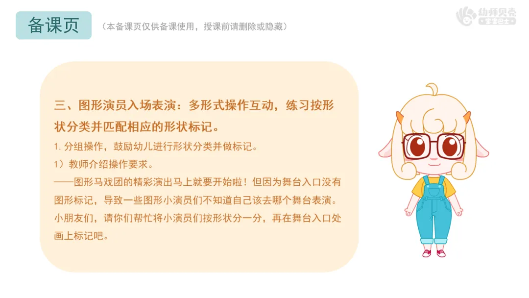 三、图形演员入场表演:多形式操作互动,练习按形状分类并匹配相应的形状标记。
