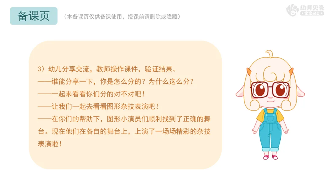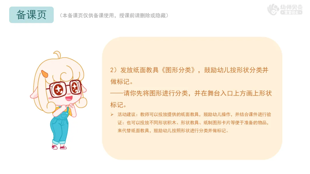 Ø活动建议:1.教师可邀请个别幼儿表述分类理由并操作,如“这里都是XX形”“我把XX形分在一起”。2.在分类过程中,