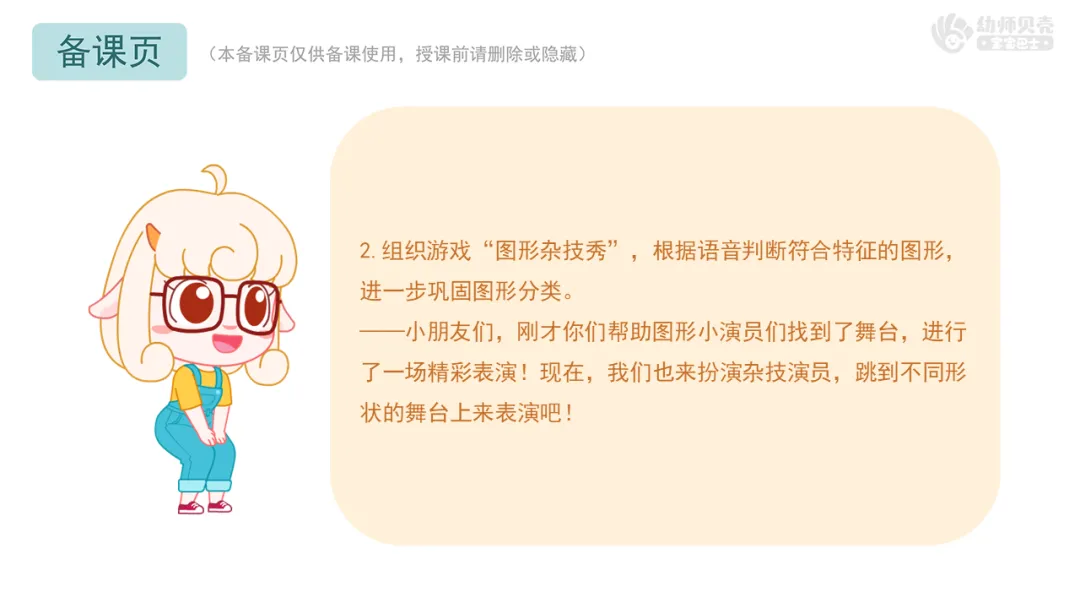 ——小朋友们,刚才你们帮助图形小演员们找到了舞台,进行了一场精彩表演!现在,我们也来扮演杂技演员,跳到不同形状的舞台上来表演吧!