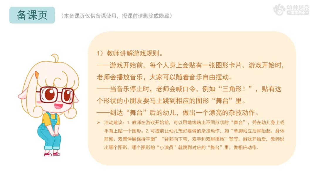 Ø活动建议:1.教师在游戏开始前,可以用地线贴出不同形状的“舞台”,并在幼儿身上或手背上贴一个图形。2.可提前让