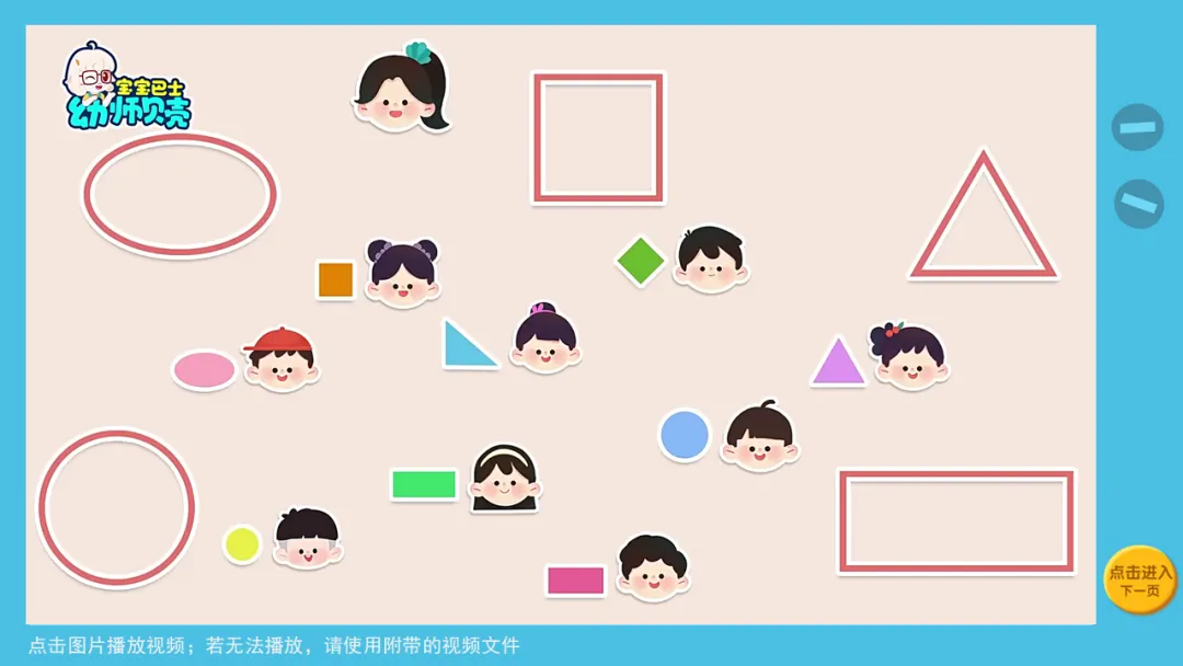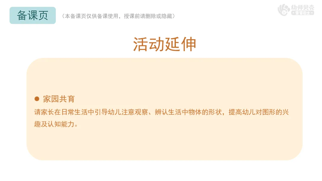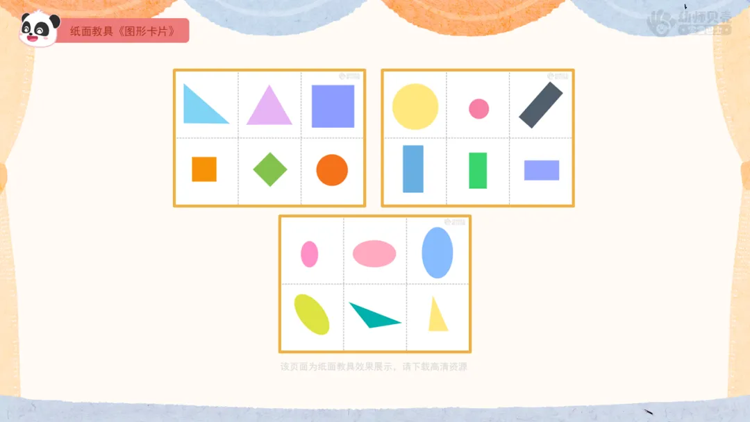 Ø活动建议:教师可以投放提供的纸面教具,鼓励幼儿操作,并结合课件进行验证:也可以投放不同形状积木、形状教具、