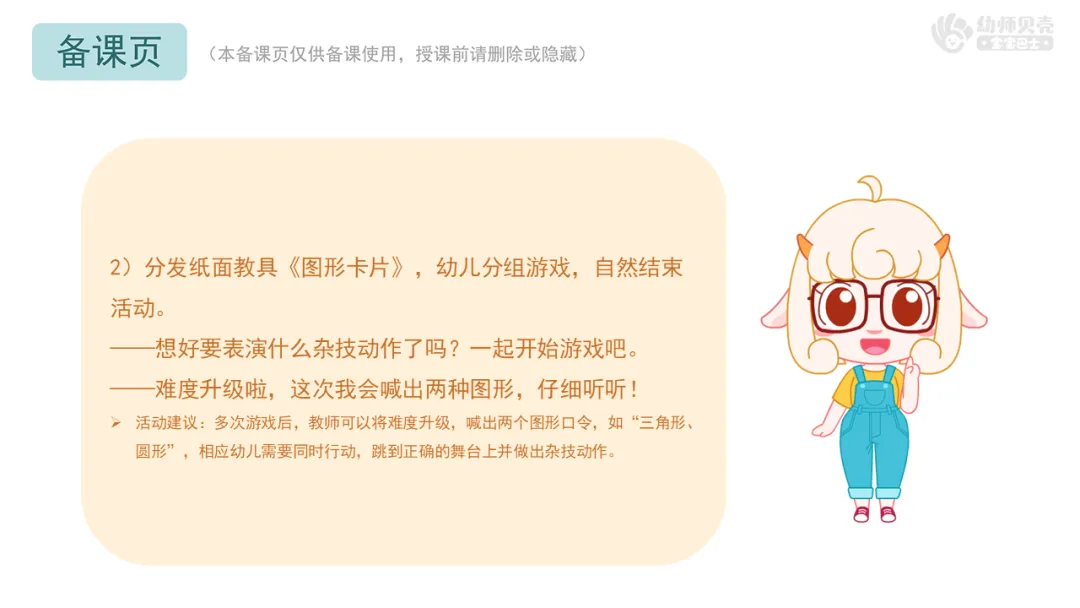 Ø活动建议:多次游戏后,教师可以将难度升级,喊出两个图形口令,如“三角形、圆形”,相应幼儿需要同时行动,跳到