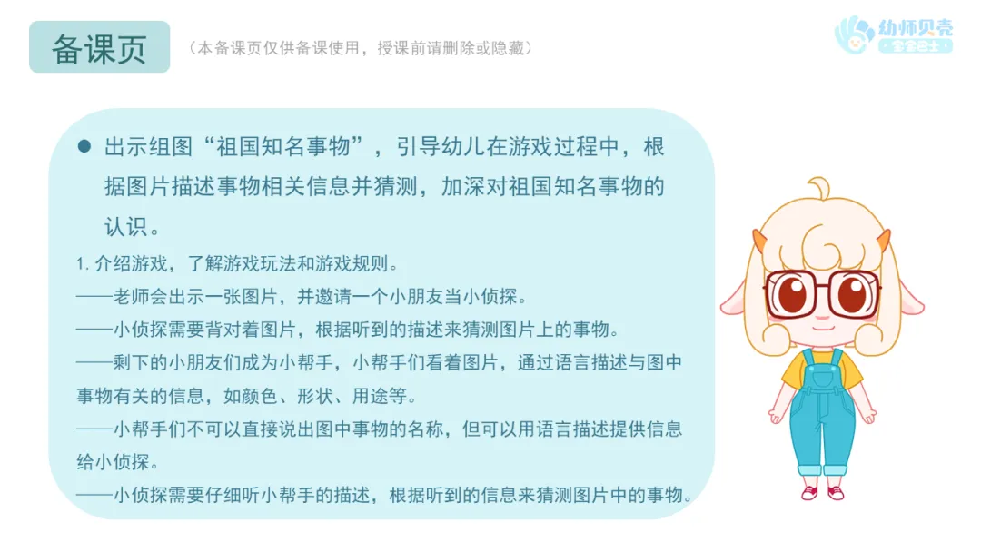 ——小侦探需要背对着图片,根据听到的描述来猜测图片上的事物。